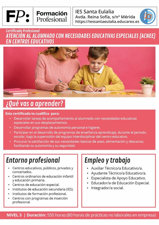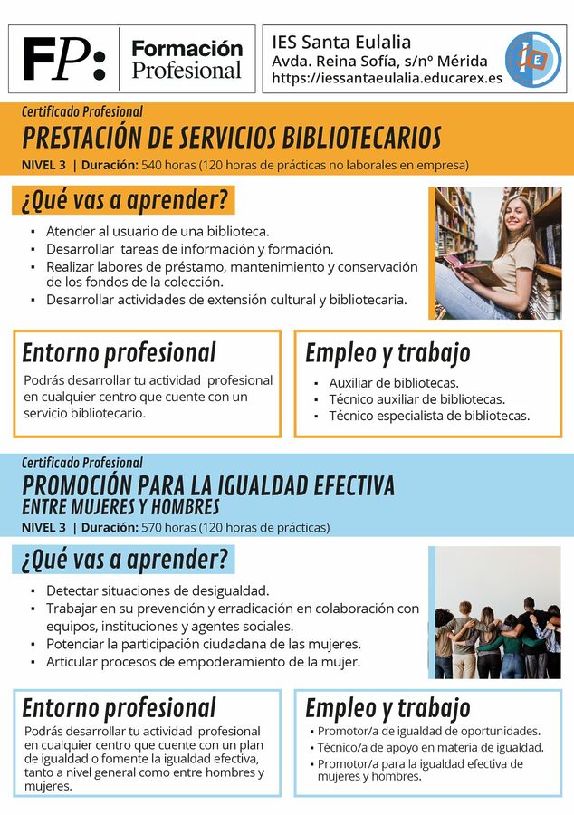 En el I.E.S Santa Eulalia se imparten en la actualidad estudios de FP Básica y FP de Grado Superior. El detalle de dichos estudios se muestra a continuación.