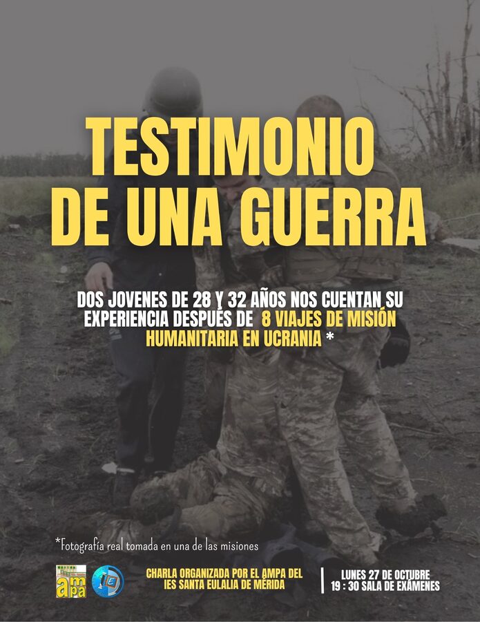 El próximo lunes 27 de octubre de 2025 los alumnos de 4º de eso y 1º de bachillerato podrán escuchar de primera mano los testimonios de dos jóvenes voluntarias que desde el principio de la guerra de Ucrania han ido a ayudar a las víctimas.